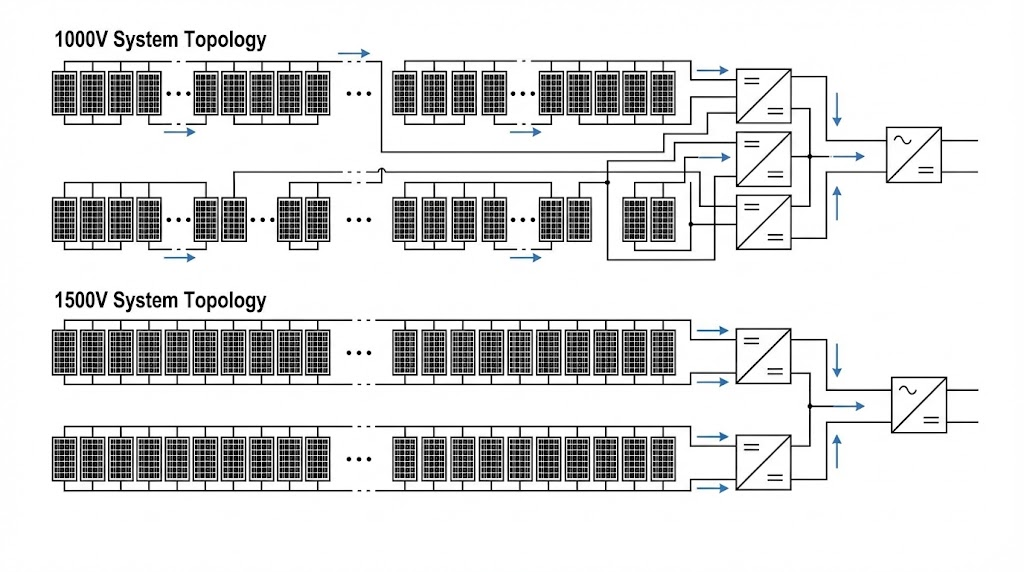 为了更直观地理解电压等级对系统设计的影响,我们可以对比1000V和1500V系统的拓扑结构。如下图所示,1500V系统凭借其支持更长组串的能力,极大地简化了从组件到逆变器的布线网络。