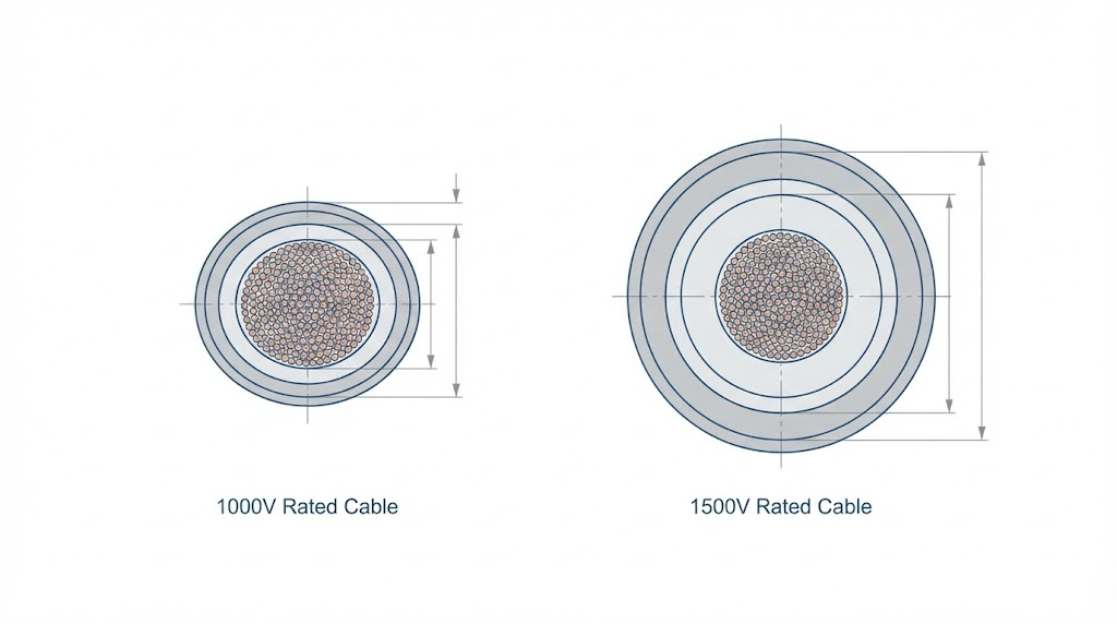 如下图所示,在相同导体截面积下,1500V额定电缆的整体外径通常更大。更厚的绝缘层提供了更大的安全裕度,有效防止了因电压波动或瞬时过电压引起的击穿风险,确保了在长达25年以上的电站生命周期内的绝缘可靠性。